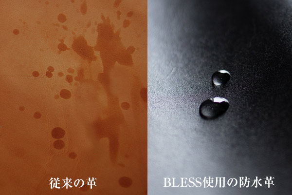 制作の段階で最も時間を要したのが本体の革の選択でした。 質のいい革は多くあるものの、BLESSの求める革は質感や柔らかさ、身に着けた時の感覚、タフな耐久性など、求めるスペックが高く革選びに難航していました。様々な角度から検討しそしてようやく辿り着いたのが姫路の老舗タンナーが開発した「防水革」です。